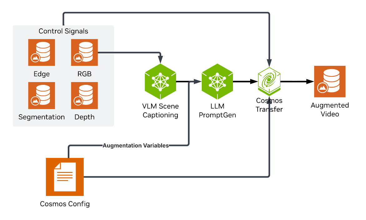 These synthetic videos then move to the COSMOS Augmentation stage, which transforms them into photo-realistic footage—bridging the sim-to-real domain gap that typically limits models trained on synthetic data. Cosmos Transfer 2.5 takes the videos and annotations along with positive/negative prompts to generate augmented, realistic-looking footage. Scene captioning is powered by Cosmos Reason 1, while Nemotron handles template and prompt generation. This allows scaling synthetic data with customizable augmentation variables to produce diverse, visually authentic training samples for Vision-Language Models.