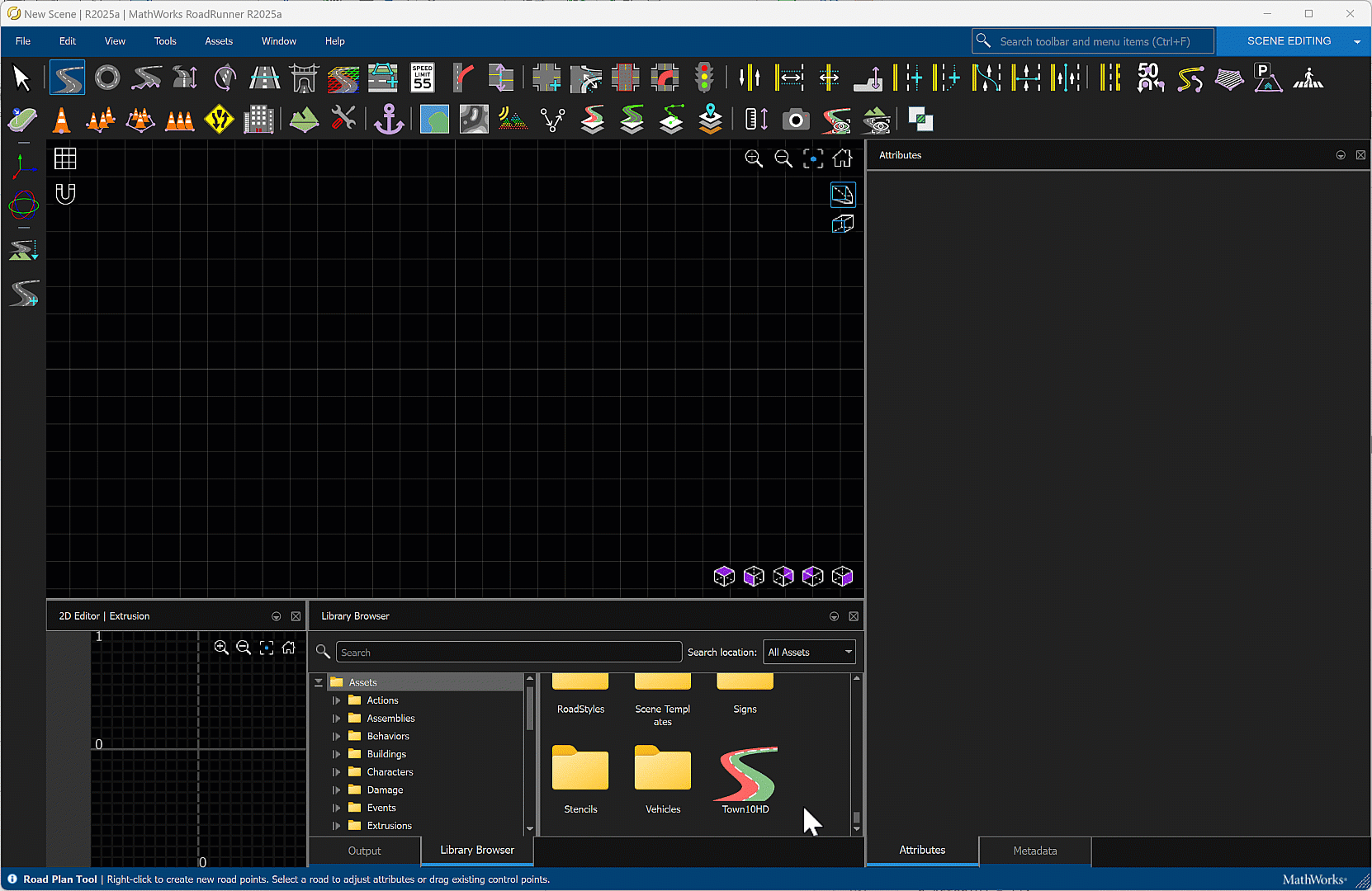 In this workflow, rather than creating a scene from scratch, we import the OpenDRIVE file for the Town 10 scene from the pre-built CARLA sample maps. The following video demonstrates how to create a new scene in RoadRunner using the Town 10 OpenDRIVE file.