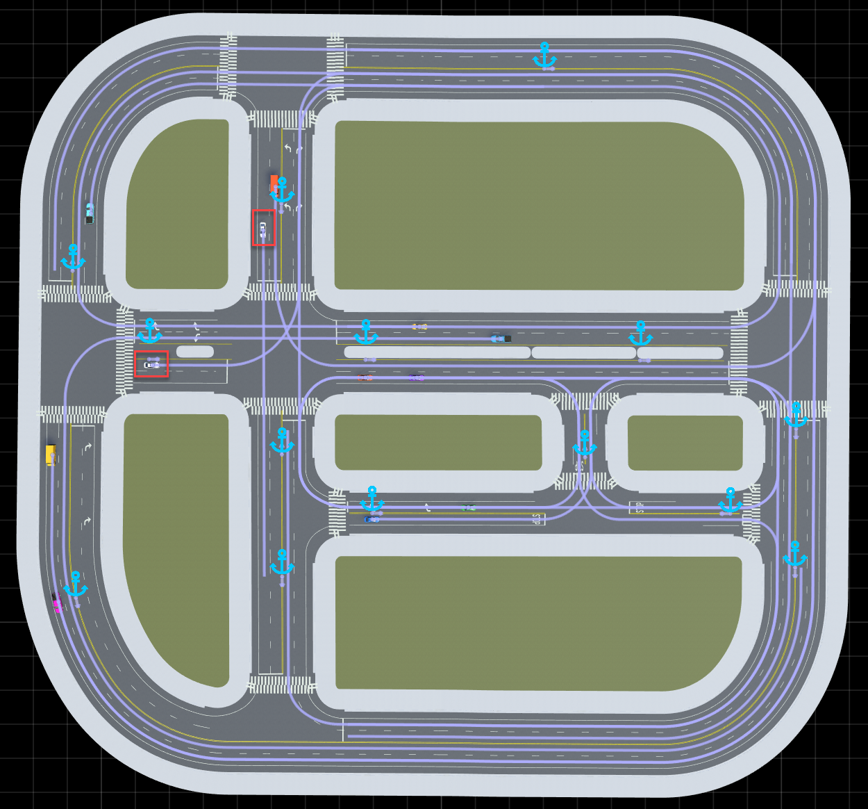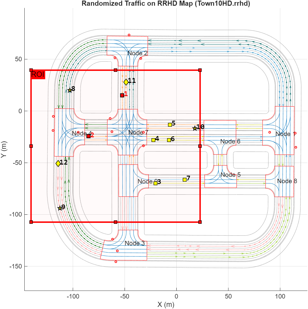 %--- Define traffic swarm configuration trafficSwarmConfig.initialSpeedRange = [10, 15]; % speed range [vmin, vmax] in m/s trafficSwarmConfig.TTC = 1; % Safe distance between vehicles in Time-To-Contact (sec) trafficSwarmConfig.MinRouteLength = 400; % min route length in meters %--- Define traffic distribution actor(1).Asset = "Sedan"; actor(1).NumOfActor = 5; % Set number of actors for Sedan actor(2).Asset = "SK_PickupTruck"; actor(2).NumOfActor = 3; % Set number of actors for CompactCar actor(3).Asset = "DeliveryVan"; actor(3).NumOfActor = 2; % Set number of actors for DeliveryVan trafficSwarmConfig.TrafficDistribution = actor; trafficSwarmConfig.NumberOfVehicles = sum([actor.NumOfActor]); trafficSwarmConfig.ROI = [-128.8 -107.4 163.3 158.1]; % ROI in [x0,y0,width,height]