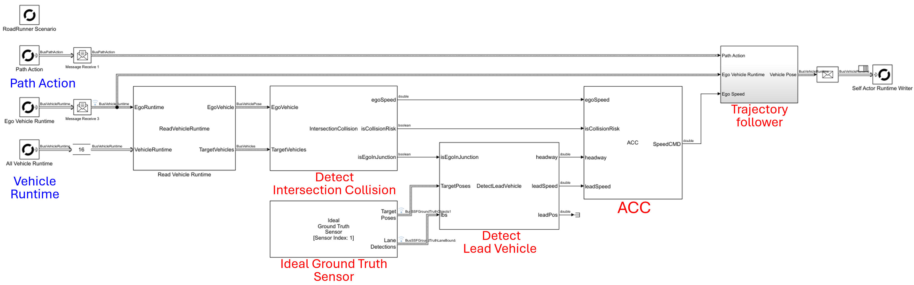 Transitioning the actor behavior model from a MATLAB-based framework into Simulink enables us to fully leverage the Model-Based Design (MBD) workflow. By integrating fundamental controllers, Trajectory Following, Adaptive Cruise Control, and Intersection Collision Avoidance, we have developed a robust “brain” for our ambient traffic actors. The ability to publish these behaviors as ready-to-run packages allows us to efficiently assign the same behavior to multiple actors, significantly improving latency and scalability in large-scale simulations.