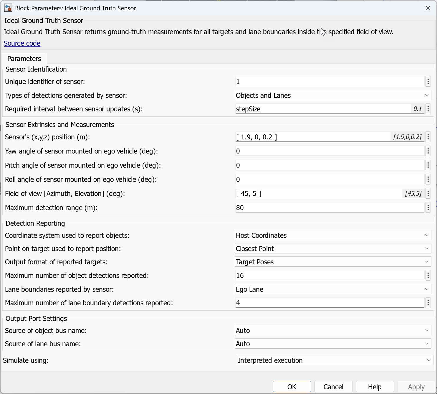 The ideal sensor outputs the poses of detected targets within its field of view, reported in the ego vehicle’s coordinate frame. The sensor also generates the ego lane boundaries when the detection type is configured to “Objects and Lanes.” Please refer to the following screenshot of the sensor settings for more information.