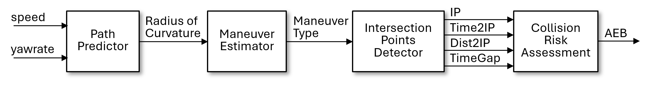 The intersection collision avoidance system consists of a series of computational blocks that assess collision risk at intersections.
