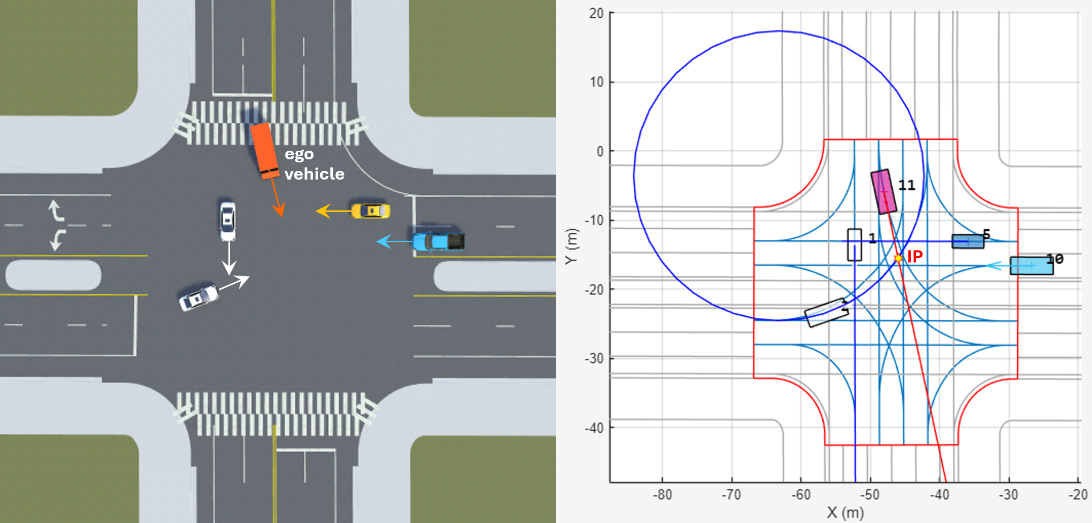 Finally, intersection collision avoidance is essential for the actor behavior model. When traffic signal information is available at the intersection, collisions can often be prevented by implementing a traffic signal follower (see this reference example for more details). However, a dedicated collision avoidance system is still necessary, as some vehicles may disregard the traffic signal.