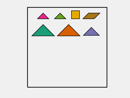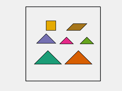 My MATLAB code Tangram opens with a screen showing seven pieces, which are called tans. There are two large triangles, one medium triangle, two small triangles, one square, and one parallelogram.