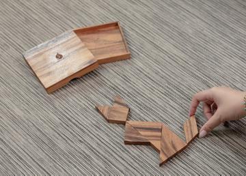 Tangram puzzles can be made with paper, plastic or wood.