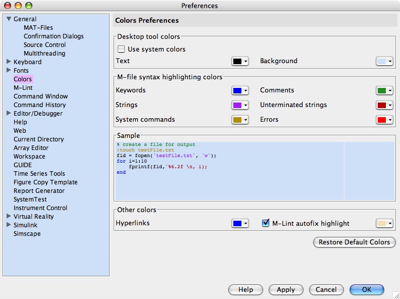 Some days my eyes are tired and other days I am just bored with a white background and black text. On these days I go and set my MATLAB Desktop background and foreground colors to something different. I usually like the soothing colors of a light blue background with black text.