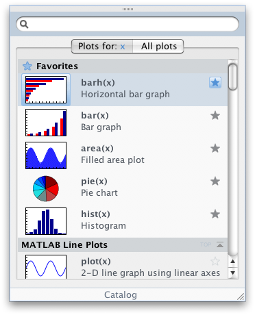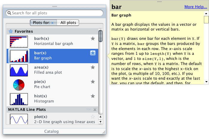 One of our overall goals with user interface design in MATLAB is to help you stay focused on what your doing. To do this, we need to offer you the right information at the right time. In the Plot Selector, this means showing you a graphic of what the plot might look like, as well as more detailed information about the what each plot does. We also show you details about a plot when you hover over it in the Plot Selector, which helps keep you “in flow”: