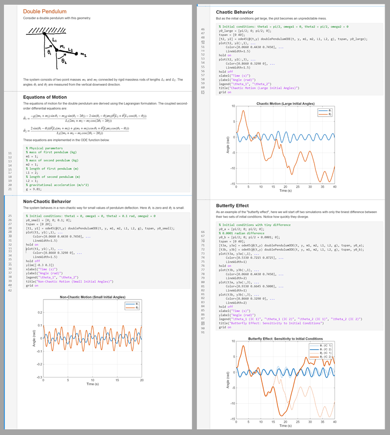 Build a MATLAB ODE for a double pendulum as specified in this diagram: @diagram.png Use the file @storyboard.md as a template for a Live Script. Use the matlab-live-script skill.