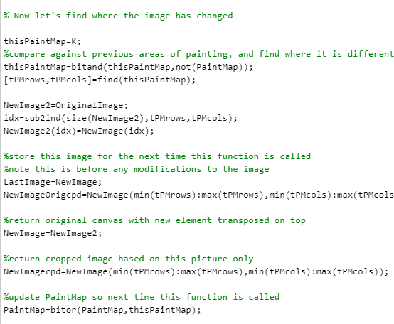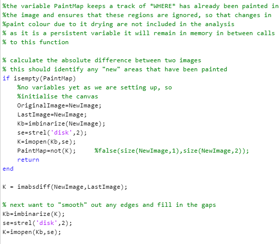 The code snippet below is from a feature extraction function that we developed and is used to extract the data from the images to build our training and test set. A similar script was used during the real-time performance to extract data from the images the Go Pro captured. Firstly, the images are processed using imread, and are then cropped to remove anything outside of the canvas using imcrop before passing on to a further function for feature extraction. The feature extraction function uses an options variable to define which aspects of the image analysis to process, which are binary flags to indicate whether they should be undertaken.