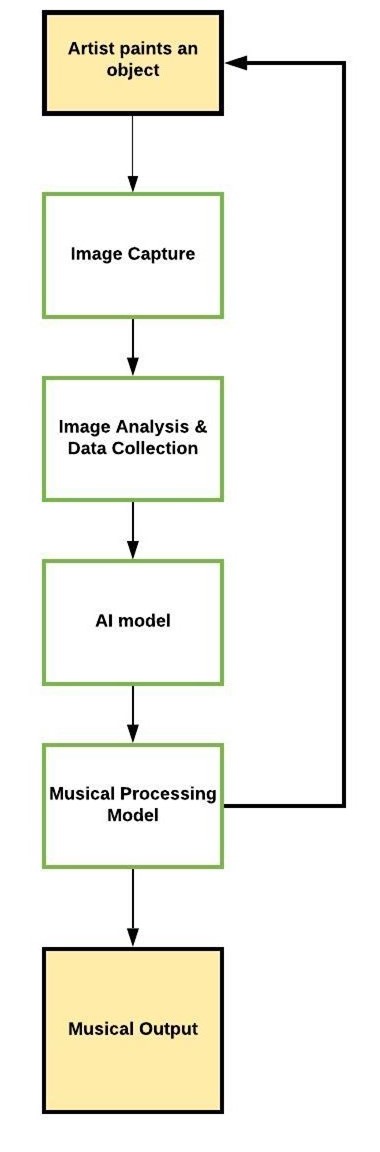 The original aim of this project was to exhibit the power of AI. The performance encourages the individual to question their own stance towards AI (is AI good or bad?). We are now in the process of building a bespoke, transportable system for Kate to be able to carry out performances with the Painting Music system independently. Following this, we will be looking to further enhance the musical output created by the system, and to also generate music in different genres (such as dance music, or blues) and to develop solutions to problems which we faced during the original performance. For example, a problem we are looking to solve is re-alignment of the canvas if the camera has accidently been moved out of its original position. We strongly believe Painting Music has many applications, from the arts and entertainment (interactive personal music generation), to healthcare (arts therapy); and we will continue to develop the system and explore these applications.