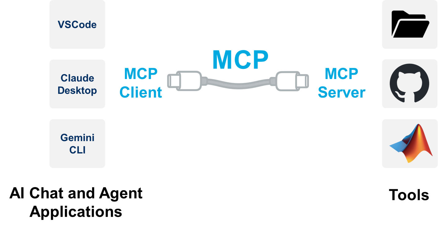 The issue raised by the copy pasting of code from a chat to MATLAB isn’t unique. In fact, you can expand this problem to any AI chat or agent (Visual Studio Code®, Claude Desktop®, Gemini CLI®, …) you want to connect to your tools (like your files, your GitHub repos, or your MATLAB). You quickly end up with a combination of MxN applications to connect. That is where the Model Context Protocol (MCP) comes in. It standardizes the connection of agentic AI apps to tools, resources and prompts, using a client-server architecture.