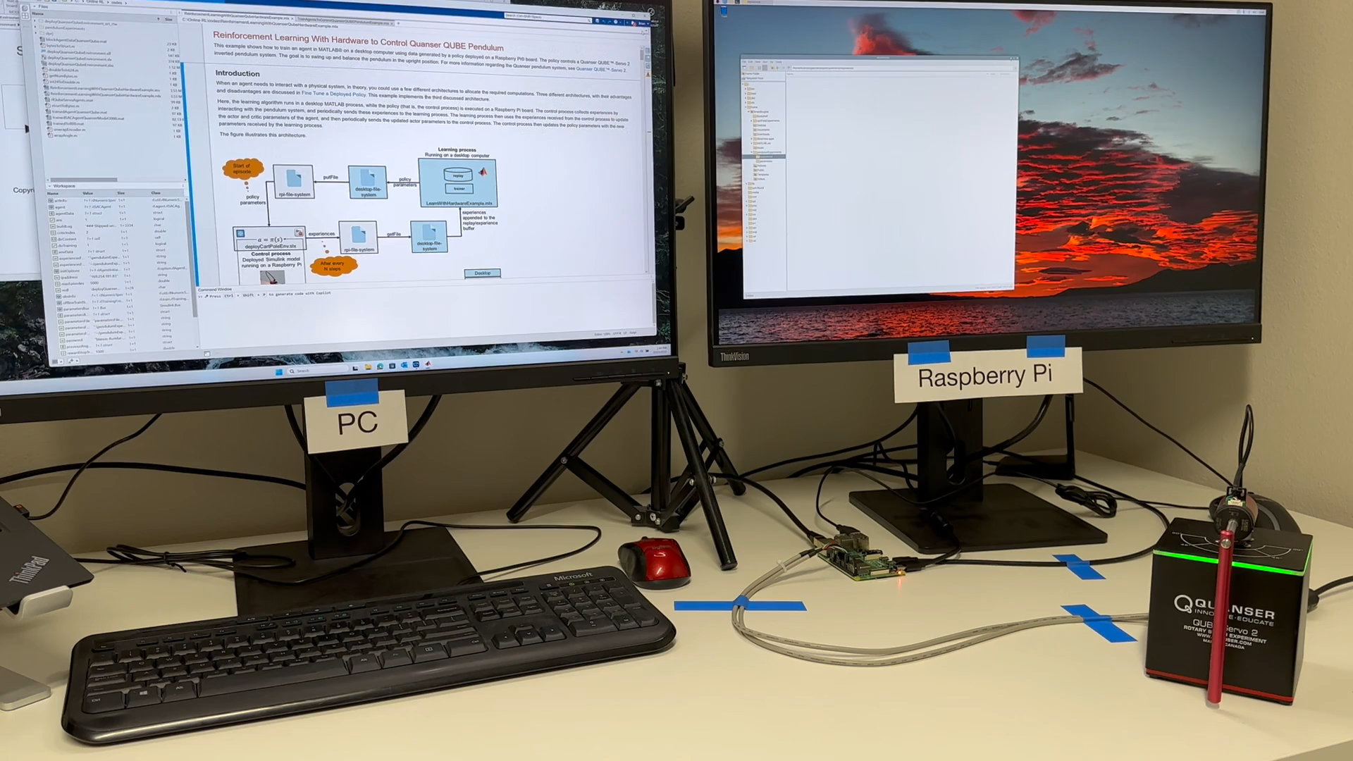 Brian demonstrates this with a Quanser® Qube-Servo 2 rotary pendulum, controlled by a policy running on a Raspberry Pi®, which is connected to a PC running MATLAB® and Simulink®. Three pieces of hardware working together—and how you use them depends entirely on your approach to training.