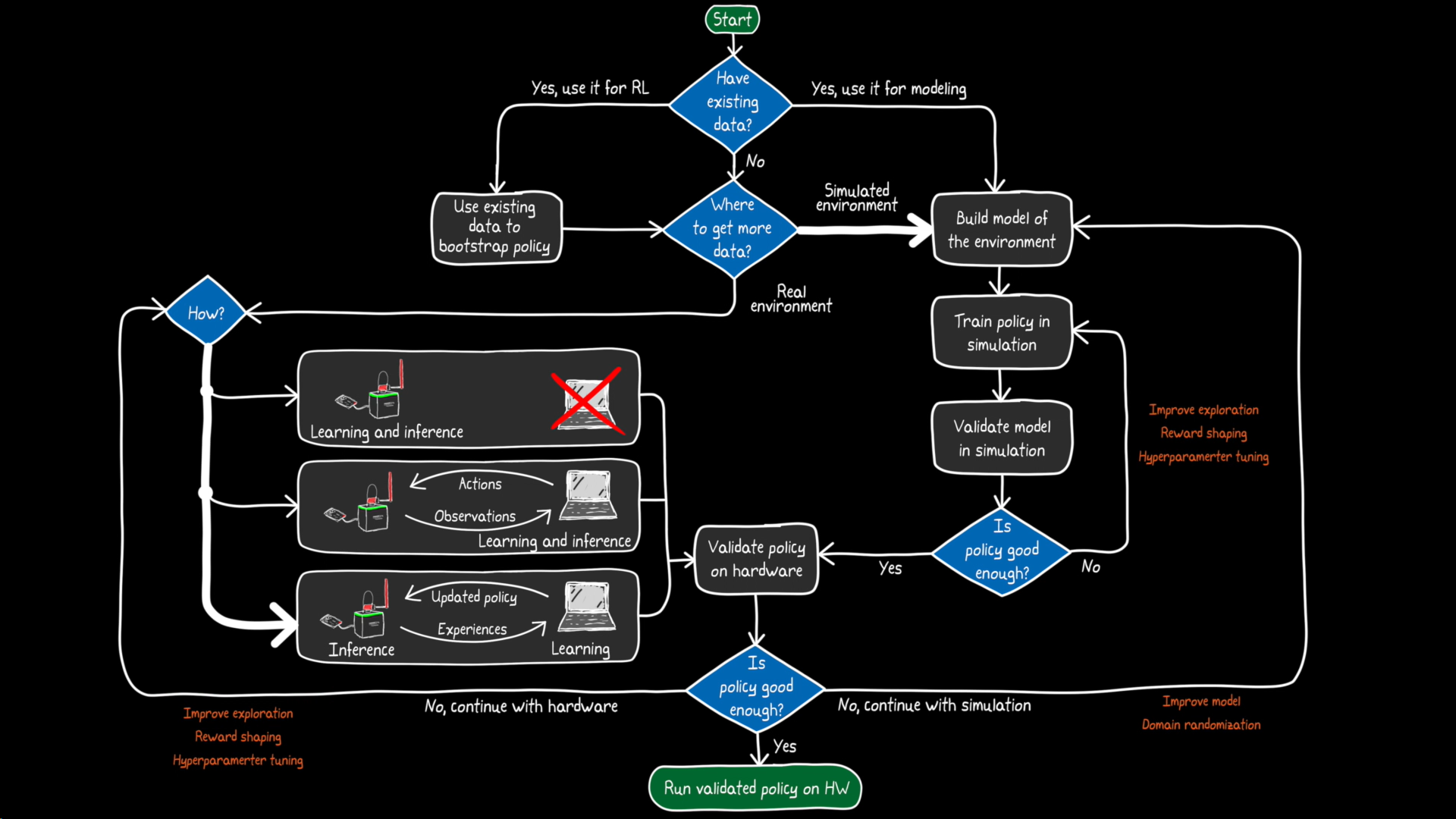 My colleague Brian Douglas just released a Tech Talk that tackles exactly this question. Not the specifics of RL algorithms (we have a whole series for that), but something that doesn't get nearly enough attention: which approach should you take to get a good policy running on your hardware?