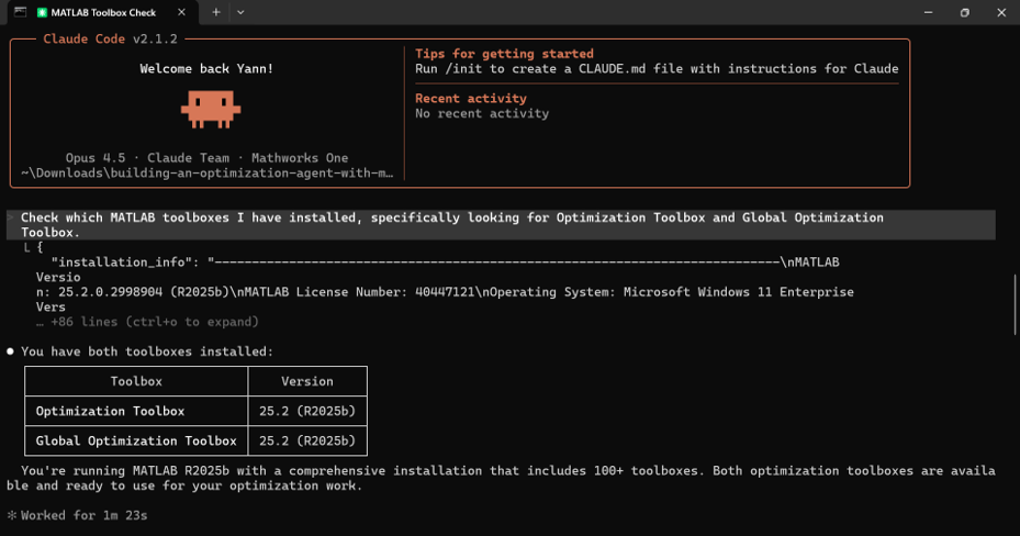 One of the first features of the MATLAB MCP Core Server I demo is the detect_matlab_toolboxes tool. Before your agent starts writing optimization code, it should verify that you have the necessary toolboxes installed.