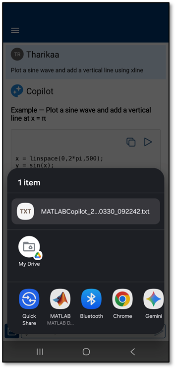 And here is the thing: none of this work is stuck on your phone. Every script you create with Copilot syncs to MATLAB Drive, so you can start prototyping on the bus and pick up right where you left off on your desktop. Copilot on your phone is not a separate experience. It is part of the same workflow.