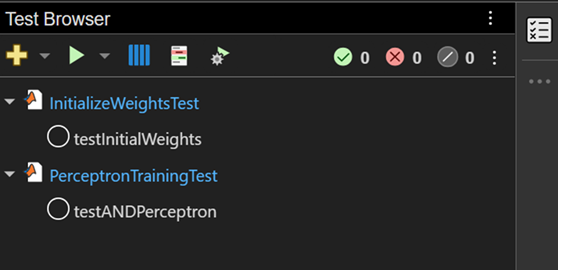 Now you can interact with the Test Browser as you normally would. Click the Run Tests button to run the test suite and see how your changes impact the perceptron performance.