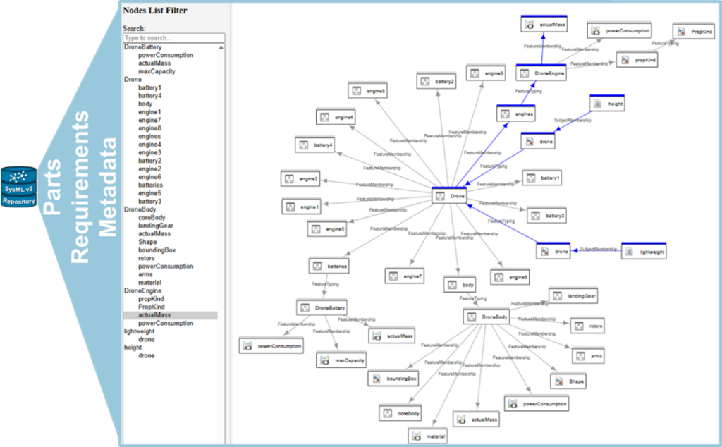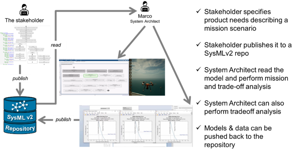 Consider the development of a quadcopter. Stakeholder specifications are published into the repository using SysML v2, enabling system architects to perform mission analysis and simulate scenarios. Trade-off analyses, such as battery sizing, are run, and results are pushed back into the repository, creating the first links in the digital thread.