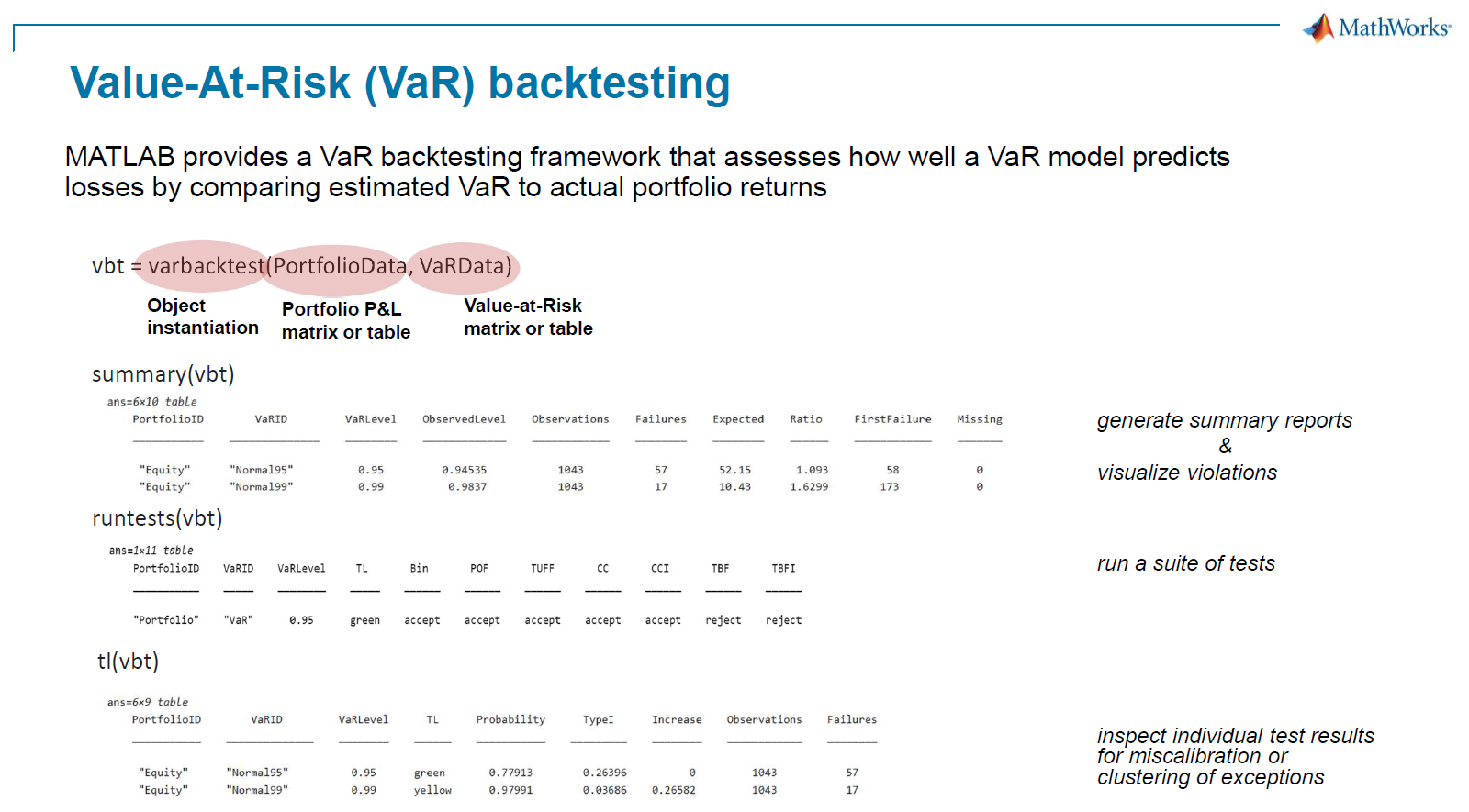 The webinar explored the MATLAB frameworks for backtesting VaR and ES. The VaR backtest object supports statistical tests like the traffic light test, binomial test, and proportion of failures. For ES, MATLAB offers multiple backtest objects based on academic research, including minimally biased tests that jointly evaluate VaR and ES forecasts. These tools help risk teams assess the reliability of ES forecasts, which is increasingly important in regulatory contexts.