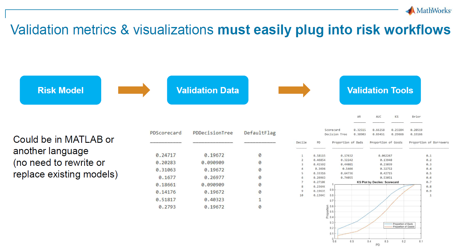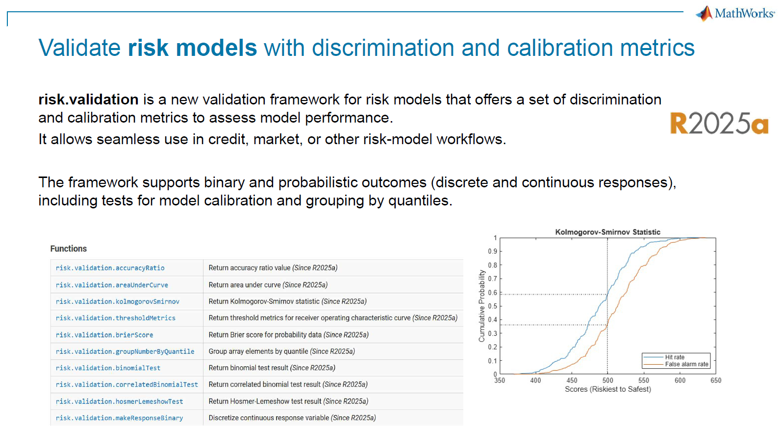 Valerio introduced the new Risk Validation Package in MATLAB R2025a, which provides a unified framework for assessing model discrimination and calibration. Discrimination measures how well a model separates different outcomes—for example, distinguishing between defaulting and non-defaulting borrowers. Calibration evaluates how closely predicted probabilities match observed outcomes. Both are essential for understanding model performance and ensuring regulatory compliance.