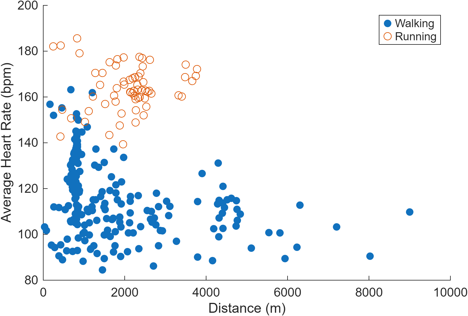 scatter(runTbl, "Distance", "AvgHeartRate", "DisplayName", "Running");