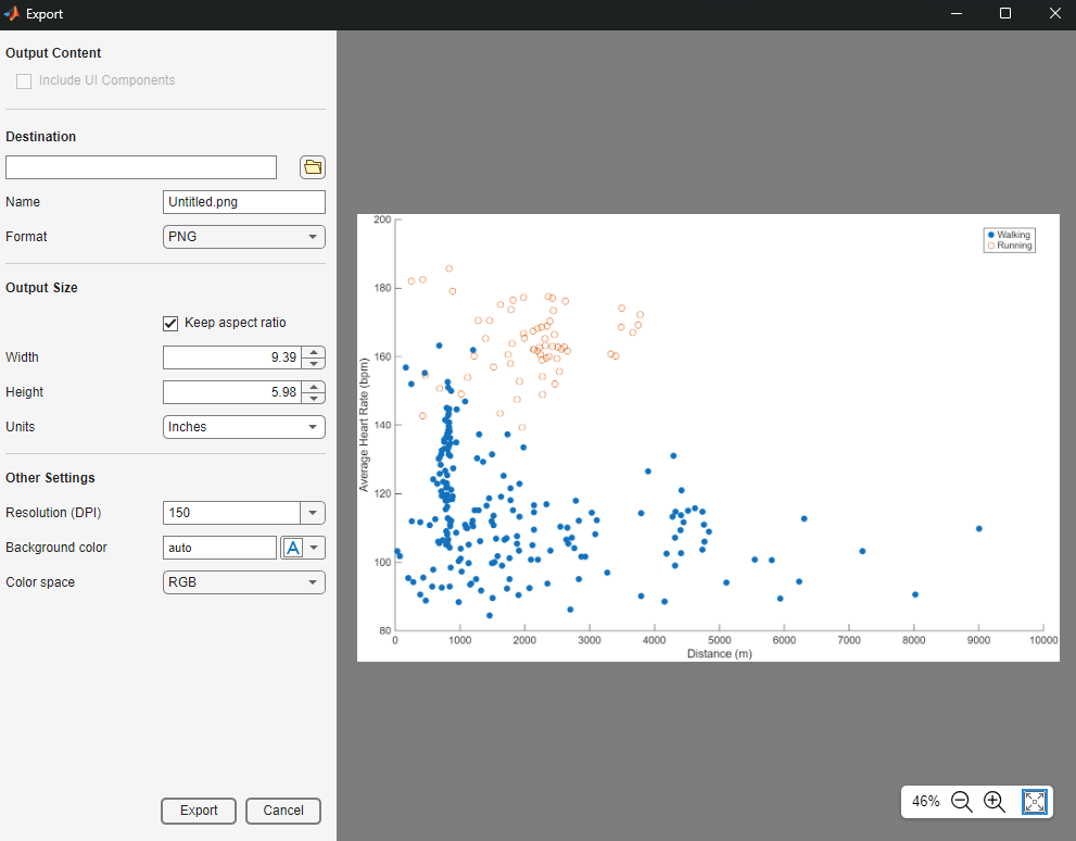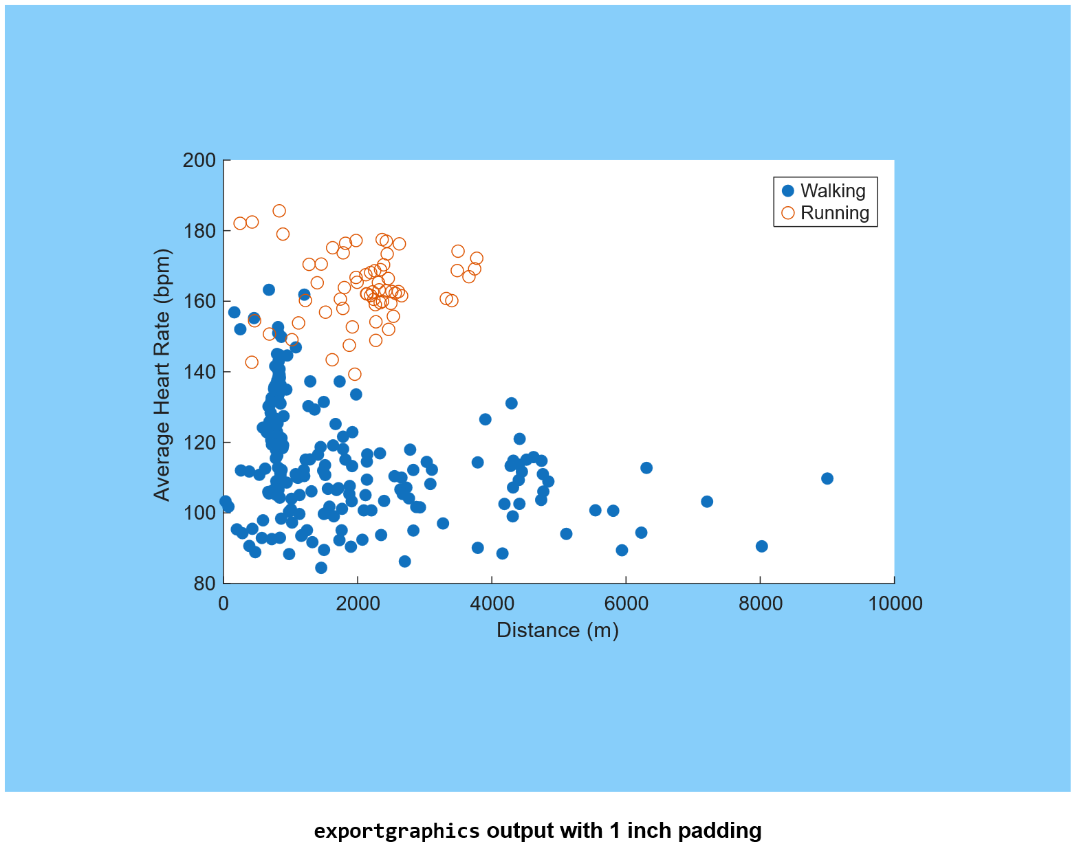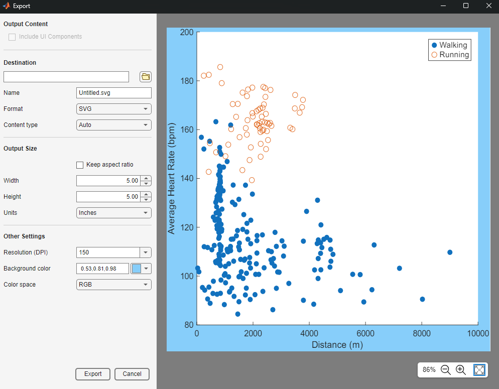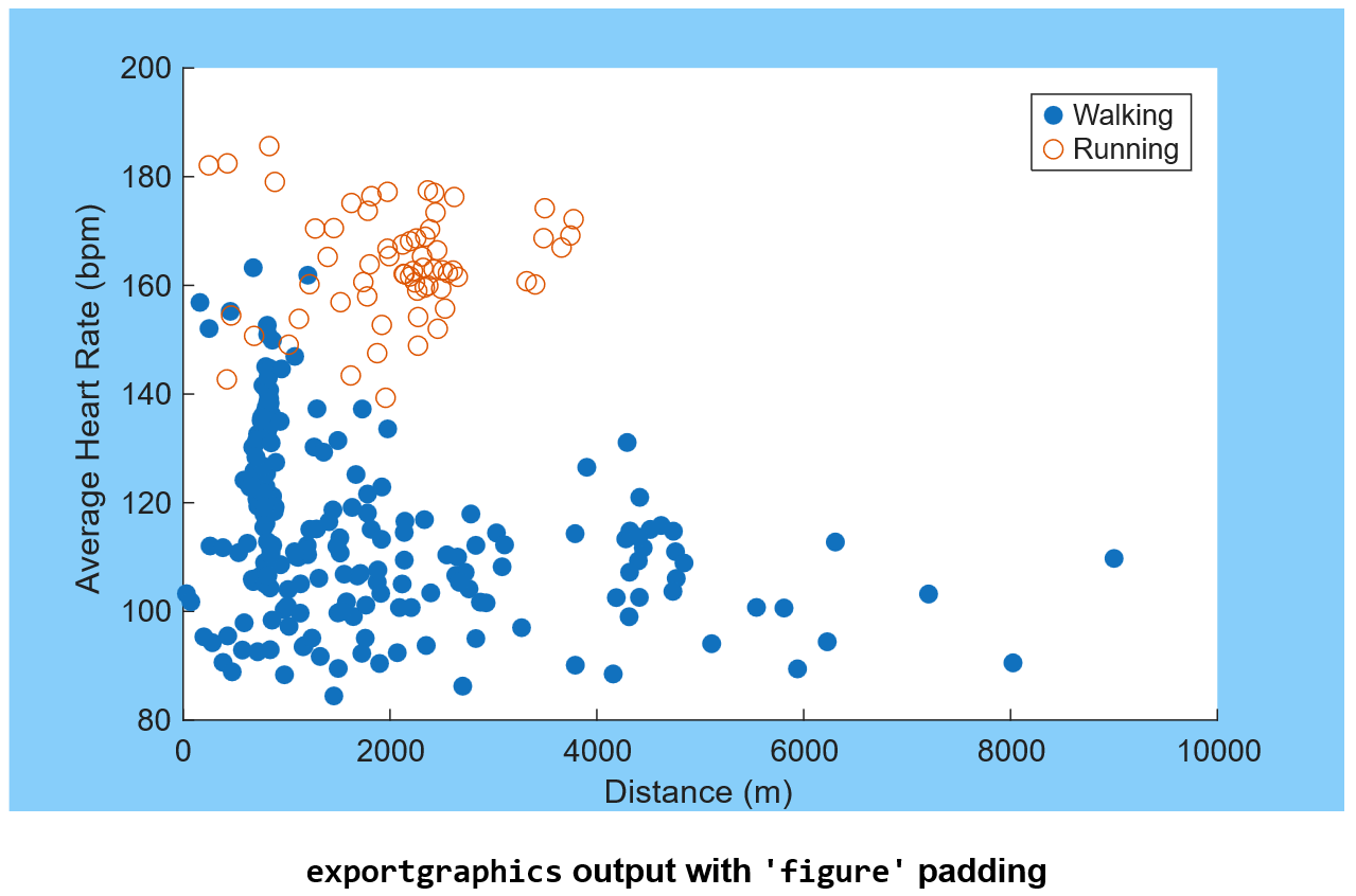Well now there's an easier way with new name-value pairs available for MATLAB Desktop and MATLAB Online in R2025a. Let's take a look at some of these changes to the exporting functions by using a plot of some exercise data that I collected when walking and running.