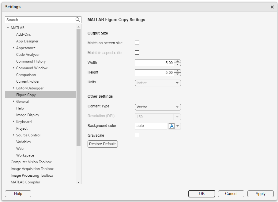 As mentioned earlier, these options are available also for copygraphics. If instead of using the copygraphics command you want to use the Copy Figure option on the figure toolstrip, you can navigate to the Figure Copy Settings. With these settings, you are able to specify the size and if you want to preserve the aspect ratio. These settings will be used if you press Copy Figure in the figure toolstrip.