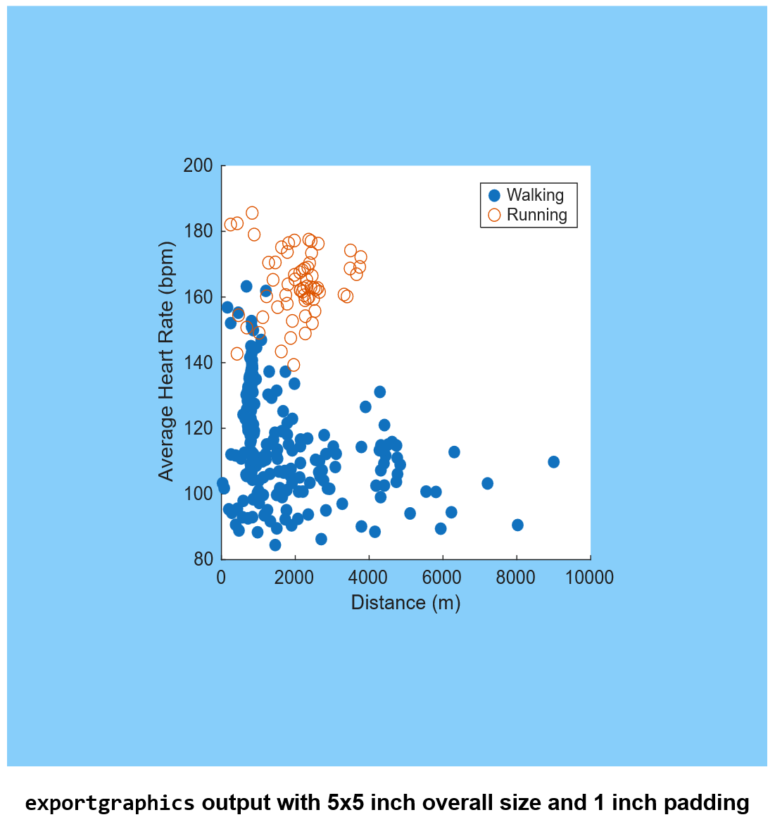 To recap, exportgraphics and copygraphics now support specifying output size, as well as support some additional functionality that allows you control over maintaining the aspect ratio and the padding. Previously, you may have used print to specify output size by using the less intuitive method of changing properties on the figure before printing, which also did not allow as much control as the new name-value pairs.