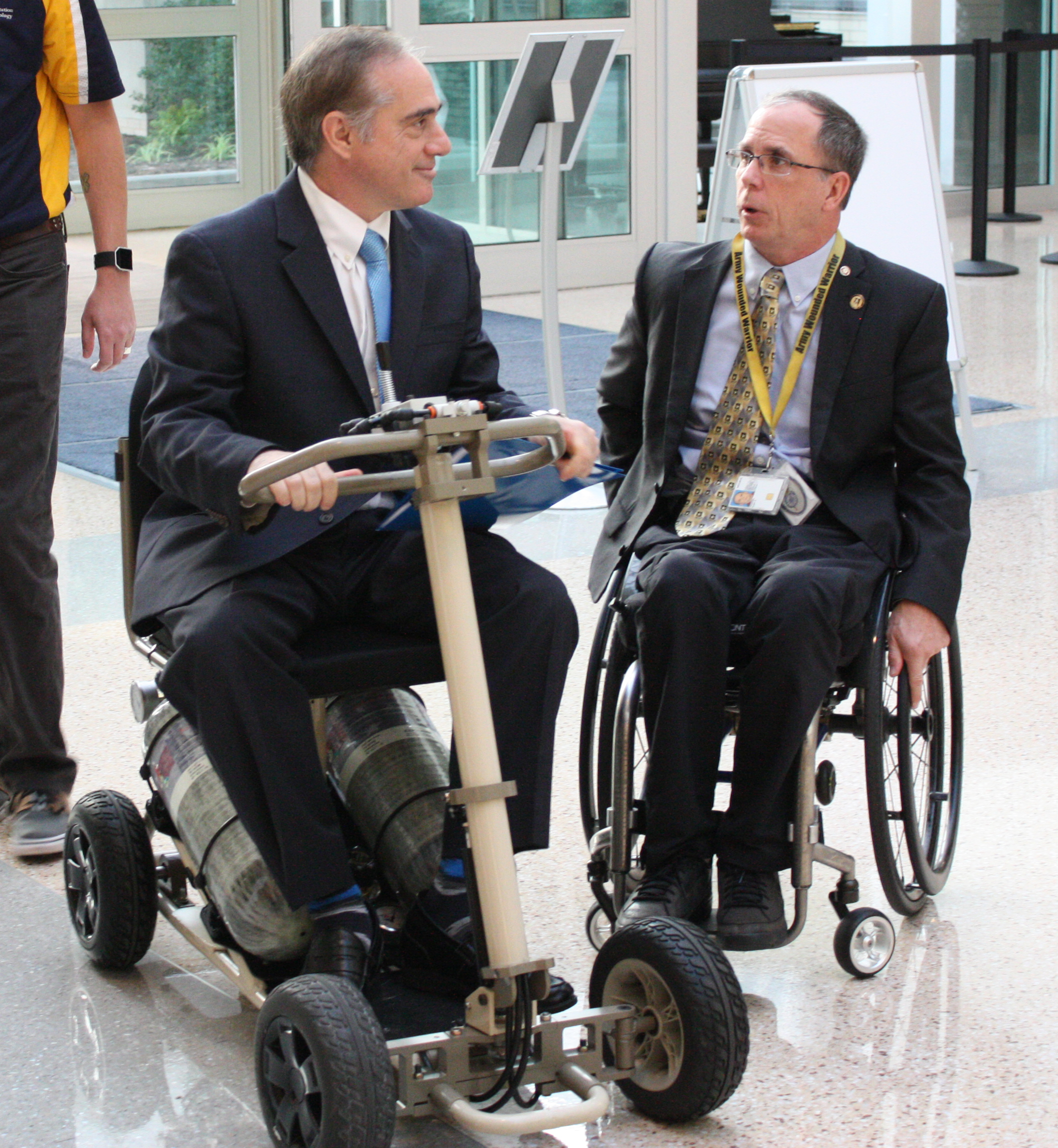 HERL Director Dr. Rory Cooper (right) with U.S. Secretary of Veterans Affairs Dr. David Shulkin. Sec. Shulkin is riding the PneuScooter. Image Credit: Michael Lain/HERL.