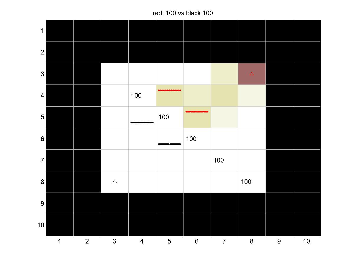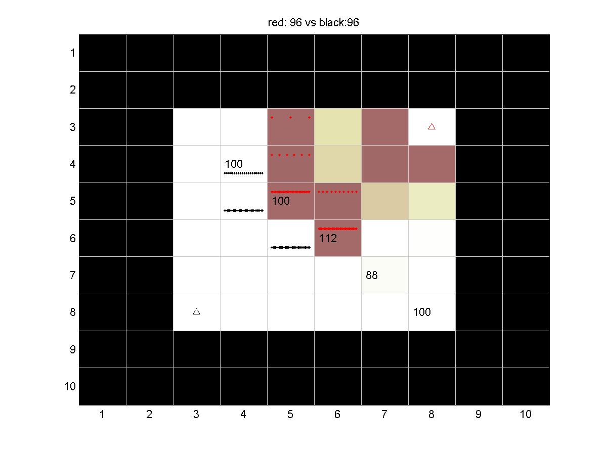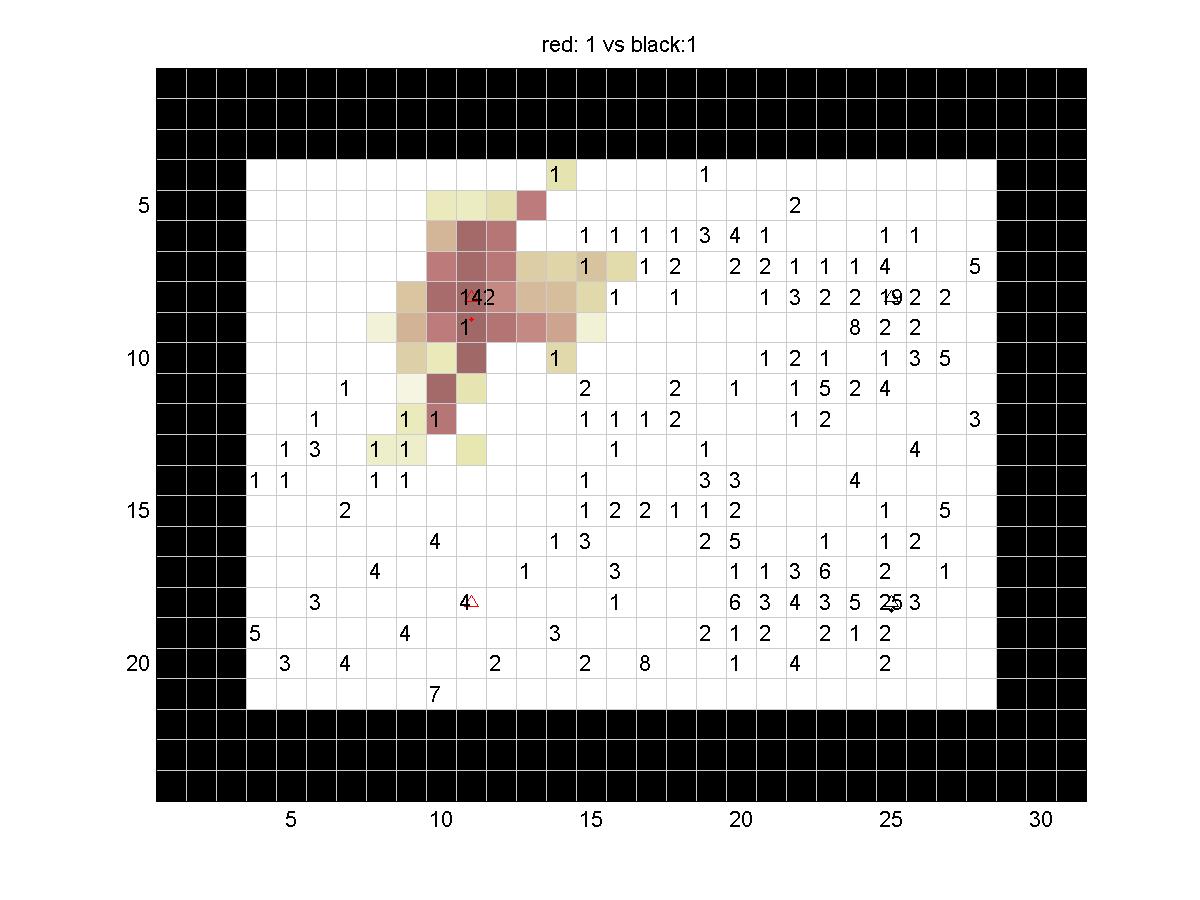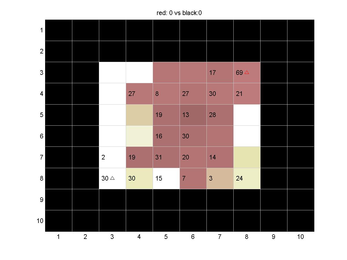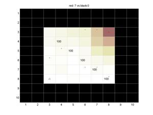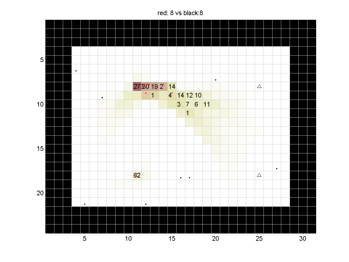 The charts below show each of the boards in the actual test suite and the results of each pairing of different Kings of the Hill. To make it easier to understand, the score is 100 for moving all the sugar to red's anthill, 0 for not moving any sugar, and it can go negative if the sugar is moved farther away. |