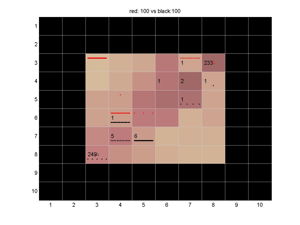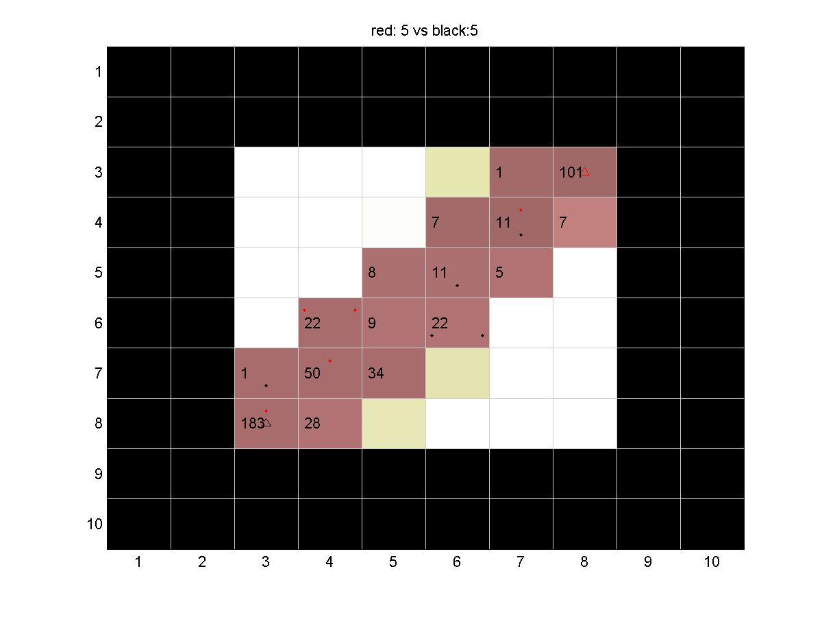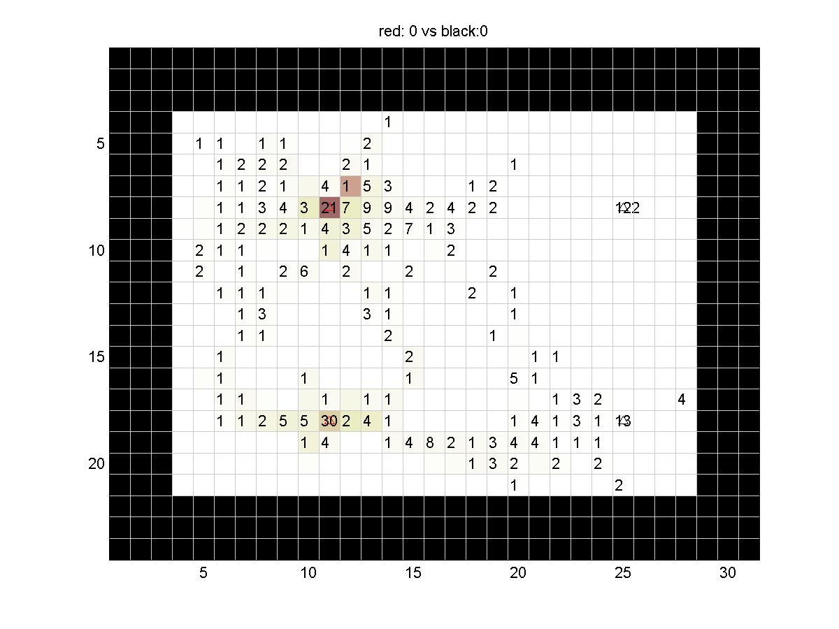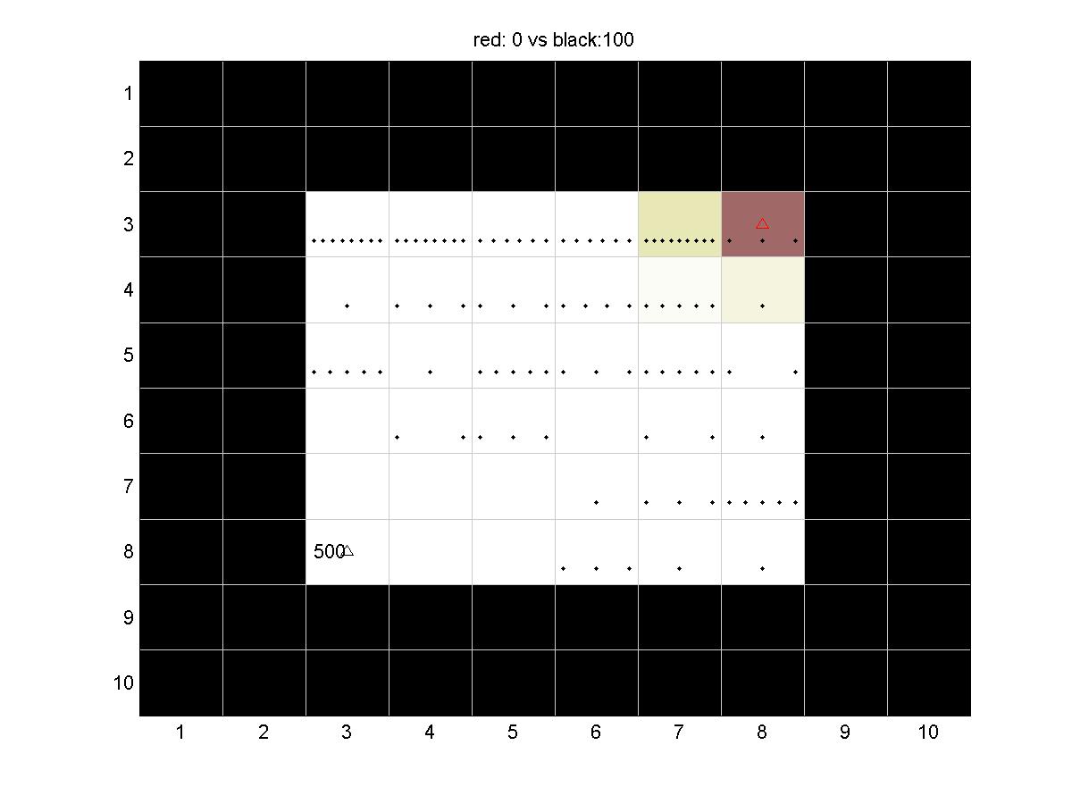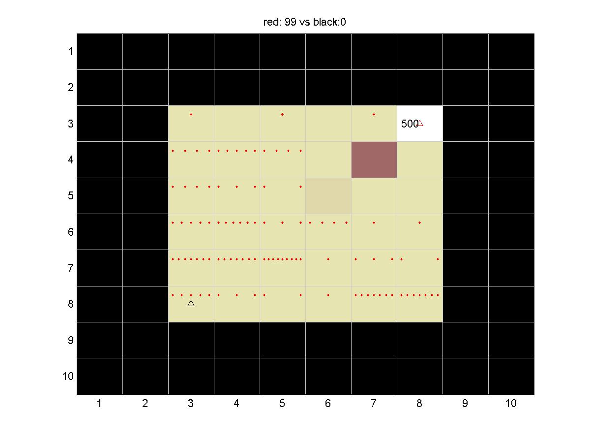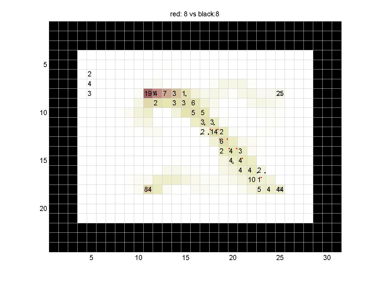 The charts below show each of the boards in the actual test suite and the results of each pairing of different Kings of the Hill. To make it easier to understand, the score is 100 for moving all the sugar to red's anthill, 0 for not moving any sugar, and it can go negative if the sugar is moved farther away. |