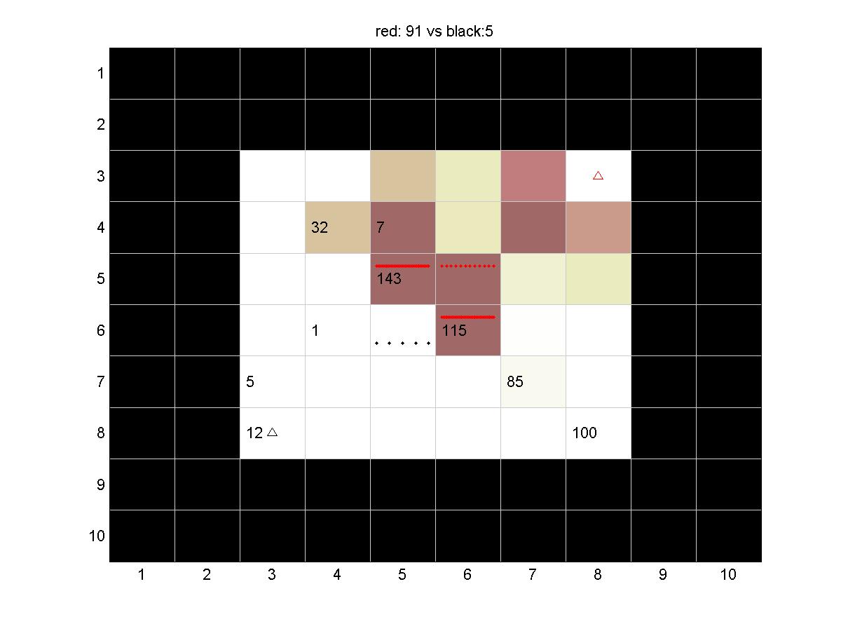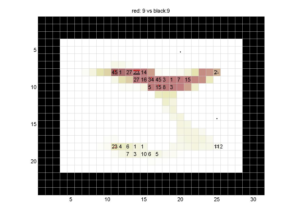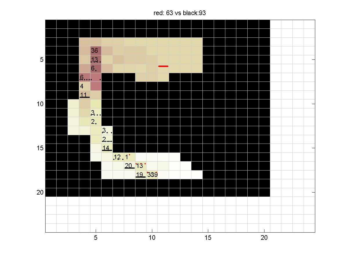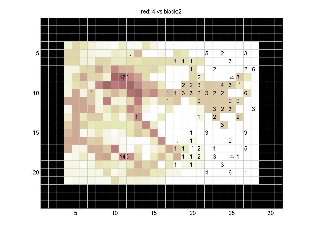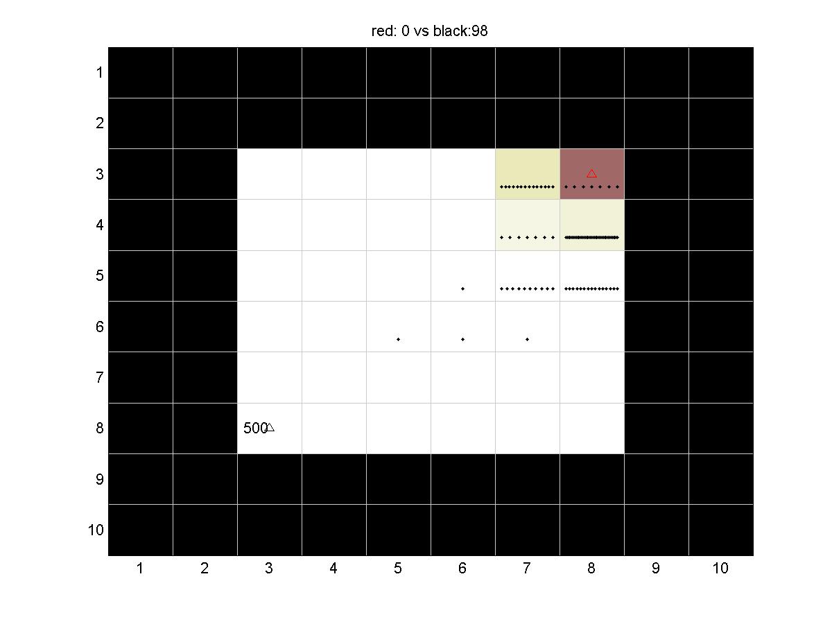The charts below show each of the boards in the actual test suite and the results of each pairing of different Kings of the Hill. To make it easier to understand, the score is 100 for moving all the sugar to red's anthill, 0 for not moving any sugar, and it can go negative if the sugar is moved farther away. |