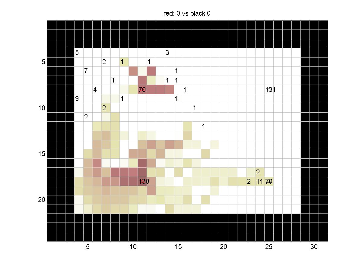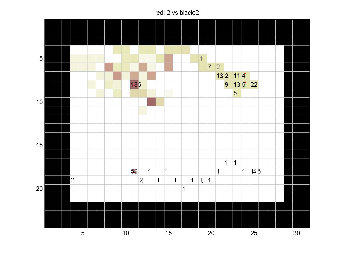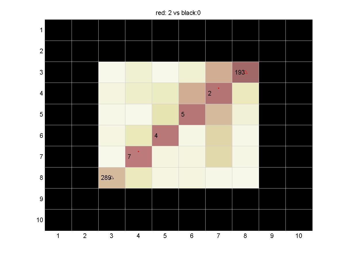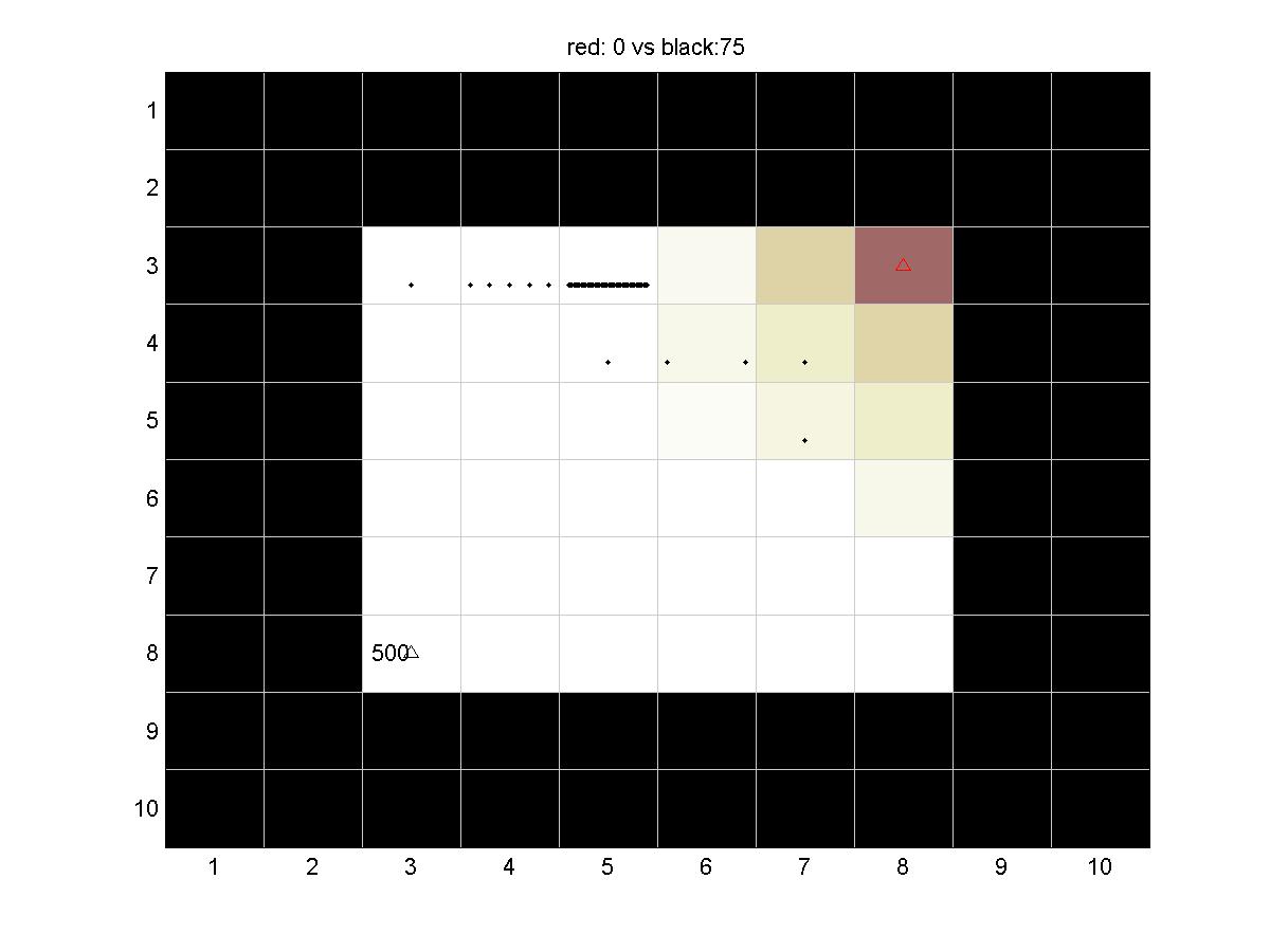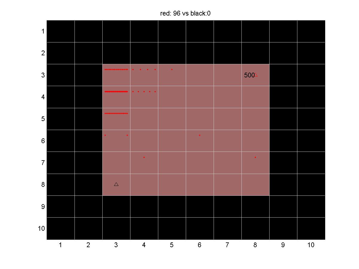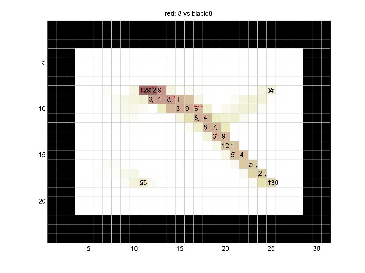 The charts below show each of the boards in the actual test suite and the results of each pairing of different Kings of the Hill. To make it easier to understand, the score is 100 for moving all the sugar to red's anthill, 0 for not moving any sugar, and it can go negative if the sugar is moved farther away. |