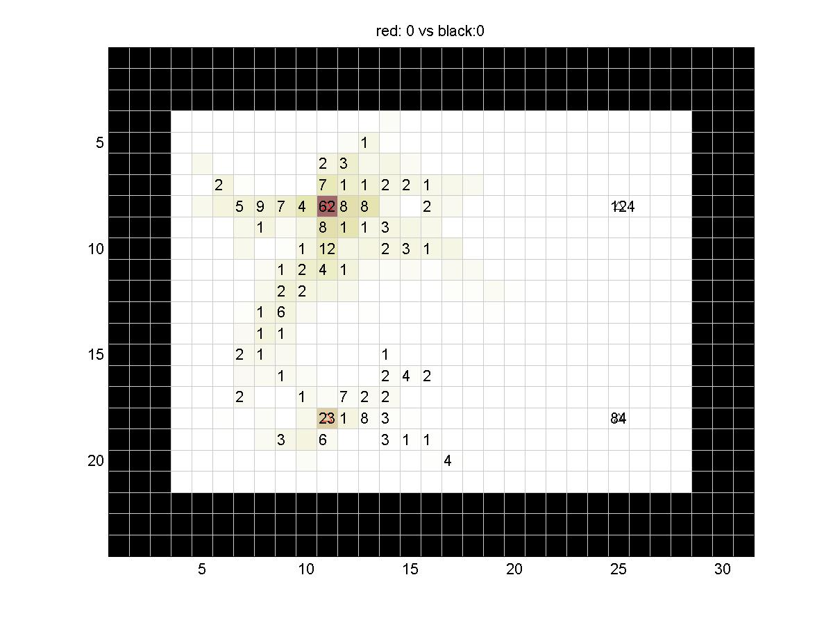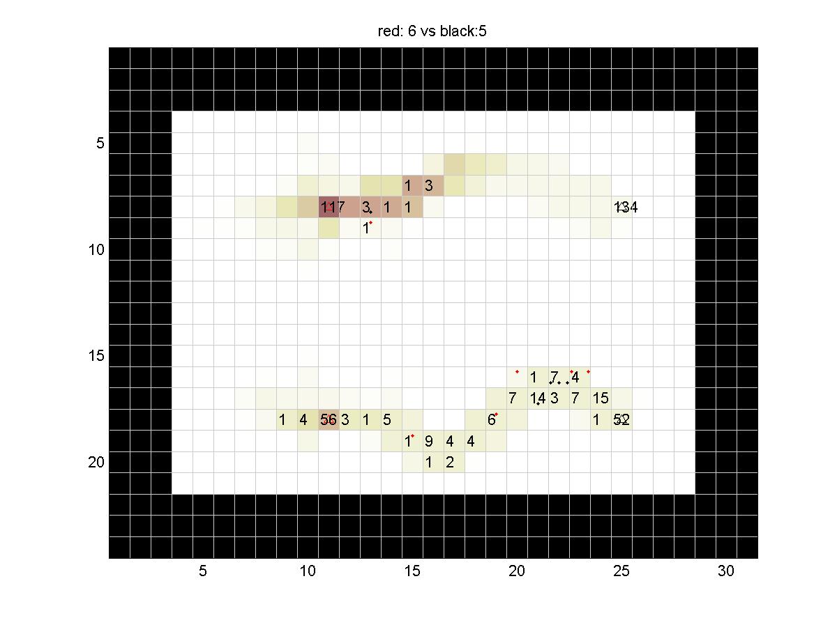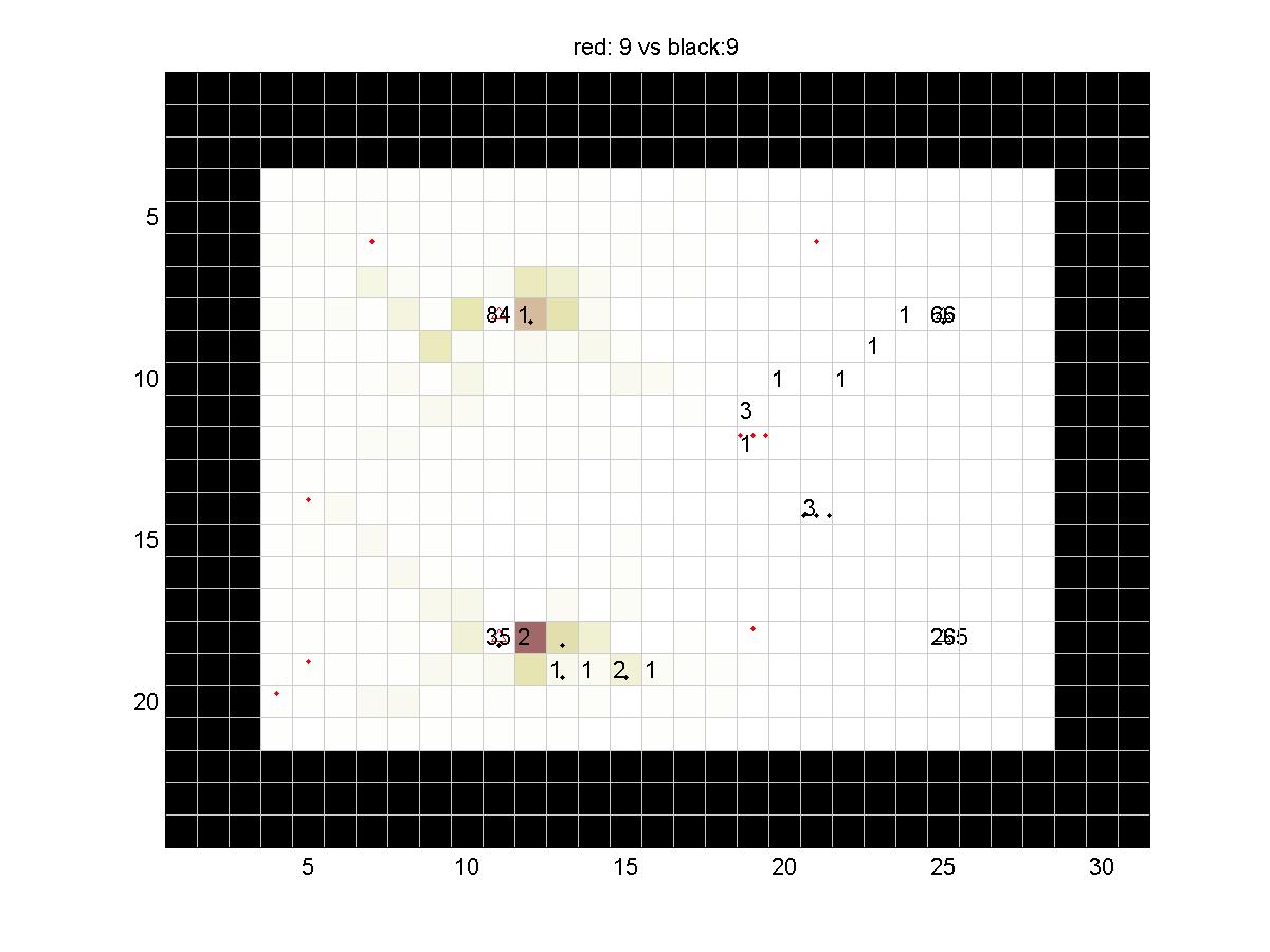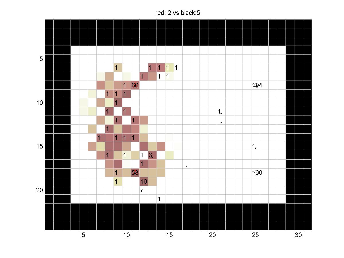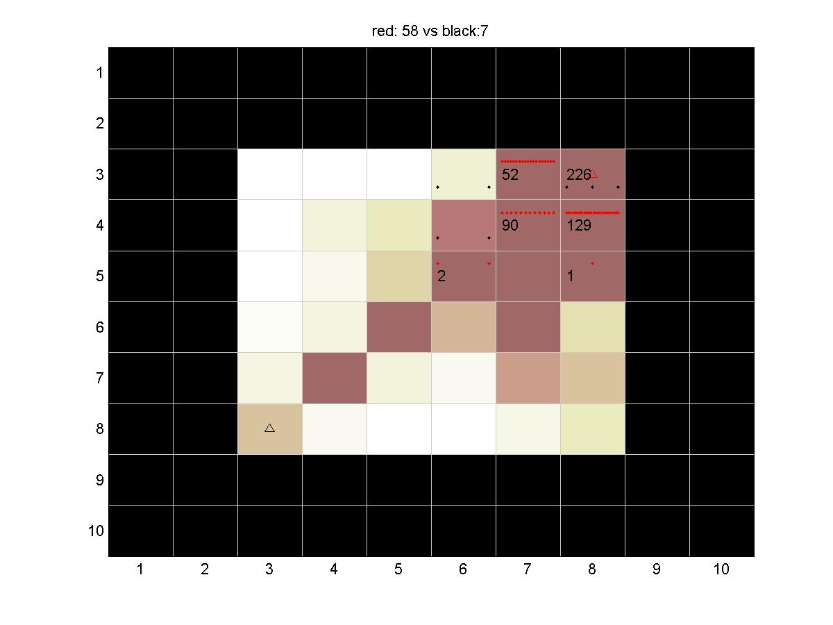 The charts below show each of the boards in the actual test suite and the results of each pairing of different Kings of the Hill. To make it easier to understand, the score is 100 for moving all the sugar to red's anthill, 0 for not moving any sugar, and it can go negative if the sugar is moved farther away. |