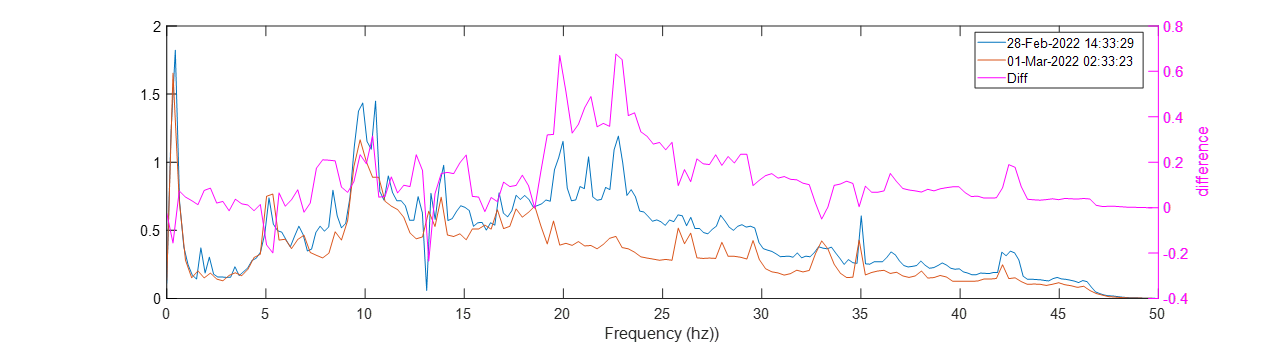 The difference line (in yellow) does not have a specific value since the two FFT’s are not normalized, but it provides a hint of where to look for differences. Choosing the right frequencies removes features in the seismic data that do not match the traffic data, as expected. Note the missing building noise features in the plots below.