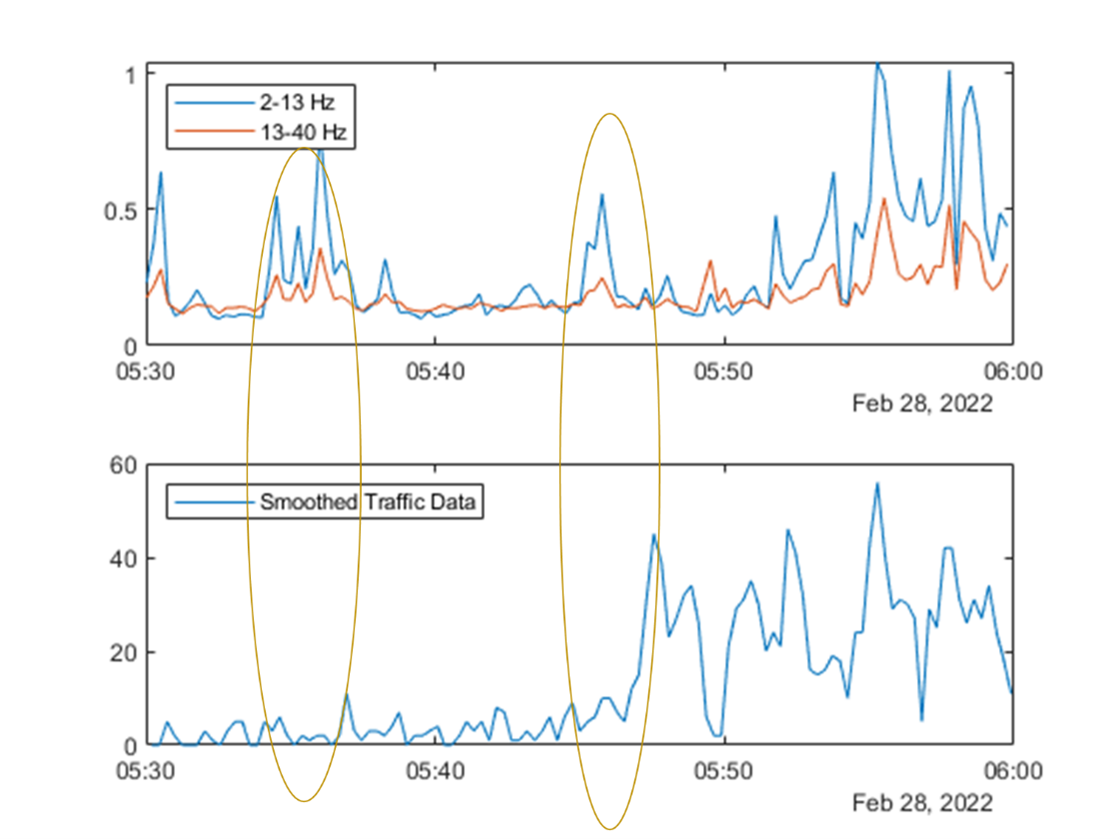 The seismic data does generally mimic the traffic data but there is not 100% correlation. One reason may be that trucks driving by at night may make large seismic events but show up as only one count in the webcam data. Another issue is that the distance from the road to the seismic detector is at least 100 m, over which many of the ground vibrations may dampen or scatter. Last the building vibrations are still present somewhat in the comparison data.