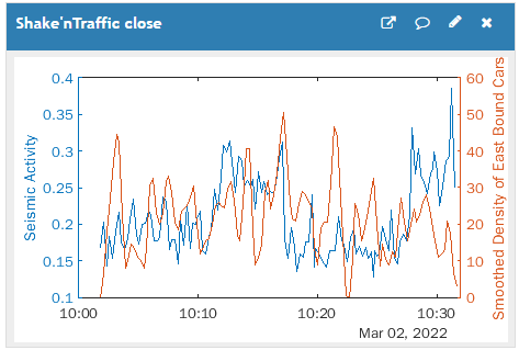 3. Use MATLAB visualizations to read the traffic monitor data and the filtered shake data, and plot over the same time range.