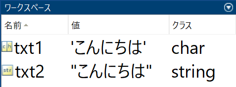 string 型は、MATLAB R2016b から追加された、文字列データを扱うための新しいデータ型です。昔から MATLAB を使っている方は、文字列といえばシングルクォーテーション(’)を使った「char 型」がなじみ深いかと思いますが、string 型はダブルクォーテーション(”)を使って作成します。