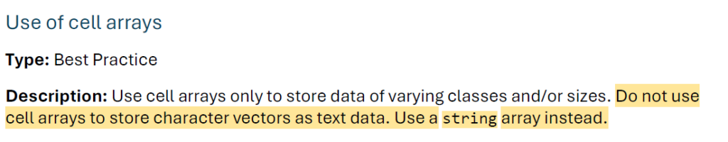また、2025年9月より MathWorks から公開しているコーディングガイドライン上では、複数の文字列を扱う場合、char 型のセル配列よりも string 型の配列を使うことが推奨されていますので、「複数の文字列が出てきたら string 型!」と覚えてしまってもよいかもしれませんね。