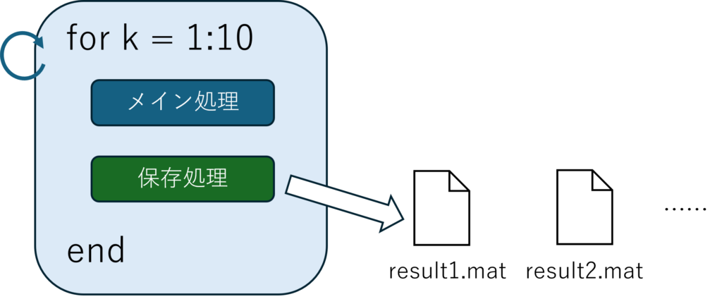 num2str() 関数を使ってループ番号(数値)を文字列に直し、’result’ と ‘.mat’ に結合することでファイル名を作る、というやり方です。数値と文字を組み合わせる必要があるので、少し複雑なコードになっていますね。