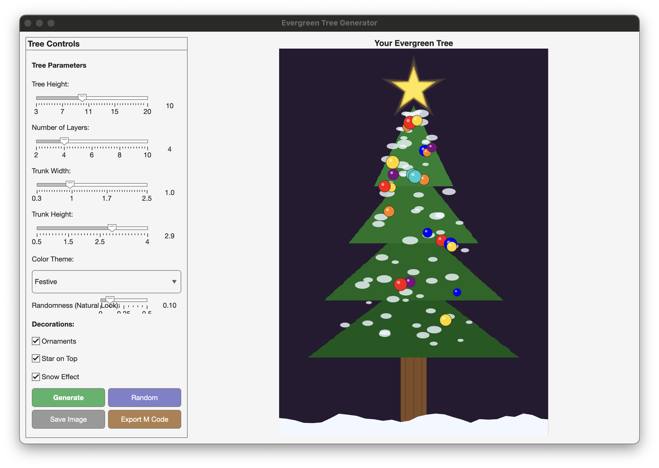 MathWorks' own Hans Scharler took this in a different direction by vibe coding an entire application that allows you to design a Christmas tree and then generate the MATLAB code to reproduce it! While taking the screenshot for this post, I noticed a little glitch with one of the sliders on my Mac. I am sure that Hans (or his AI agent) will soon update the application's GitHub repo to fix this. Download it and have a play or just open it in MATLAB Online by clicking on the badge: