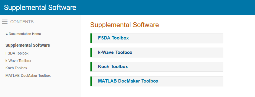 Many of the toolboxes featured on Pick Of The Week include superb documentation that integrates with MATLAB's documentation system. They appear in a section called 'Supplemental Software' and here's that section in my MATLAB. You'll recognize a couple of picks from last year such as FSDA Toolbox and k-Wave in the list along with a couple you haven't seen before.