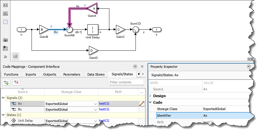 As discussed in this previous post, another common customization is to retain a specific signal in the generated code. For our state-space example, let's say we want to be able to access "A*x" and "B*u":
