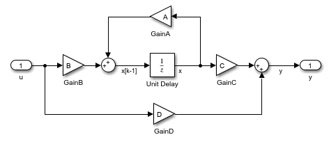 While Simulink includes a Discrete State-Space block, for the purpose of this blog post, I decided to implement it as typically seen in controls or dynamic systems books: