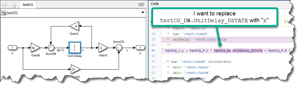 Let's say that we want the generated code to read and write the state of the Unit Delay block in our state-spate system to a variable named "x" that the hand-written code will be able to access.