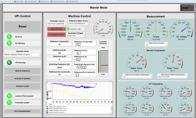 Weg//weiser’s solution is a universal test system for all types of electric motors. The software provides a fully automated evaluation of all measurement data across the entire speed range, deriving all relevant control parameters for optimal and safe motor operation. The flexible environment can be integrated into existing testbed systems, while allowing for customer-specific adaptations to meet tailored process solutions and expandable to future needs.