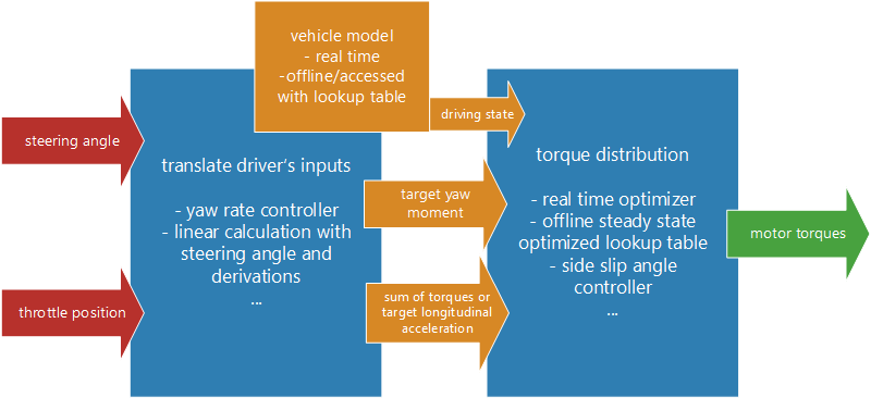 The driver’s inputs, which are steering angle and throttle pedal position, must be translated into variables that can be used in vehicle dynamics calculations. These are a target yaw moment and a desired longitudinal acceleration or sum of motor torques. The desired acceleration is just set proportional to the throttle pedal. Yaw moment is more complicated. An often used and well-known attempt is to apply a yaw rate controller, which sets the target yaw moment. The target yaw rate can be calculated from Ackermann geometry or optimizations on a steady state vehicle model. A yaw rate controller is especially suitable for inexperienced drivers who are not used to a vehicle swinging off. More experienced drivers sometimes feel limited when driving with a yaw rate controller. For them you can use an easier approach: just set the yaw moment proportional to steering angle and its derivative. And there are a lot more possibilities to do that. If torque distribution properly sets the yaw moment, one has a more agile or more stable car, depending on the driving situation. The task for torque distribution is to fulfill the driver’s targets, while maximizing lateral acceleration simultaneously. This calculation should be based on a double track vehicle model. Again, there are a lot of options, how to do that. The optimization can be done in real time on the vehicle, going from tire to tire and increasing its load to the maximum. Another possibility is to optimize steer angle and motor torques offline on a steady state vehicle model and put them into the Simulink model as a lookup table.