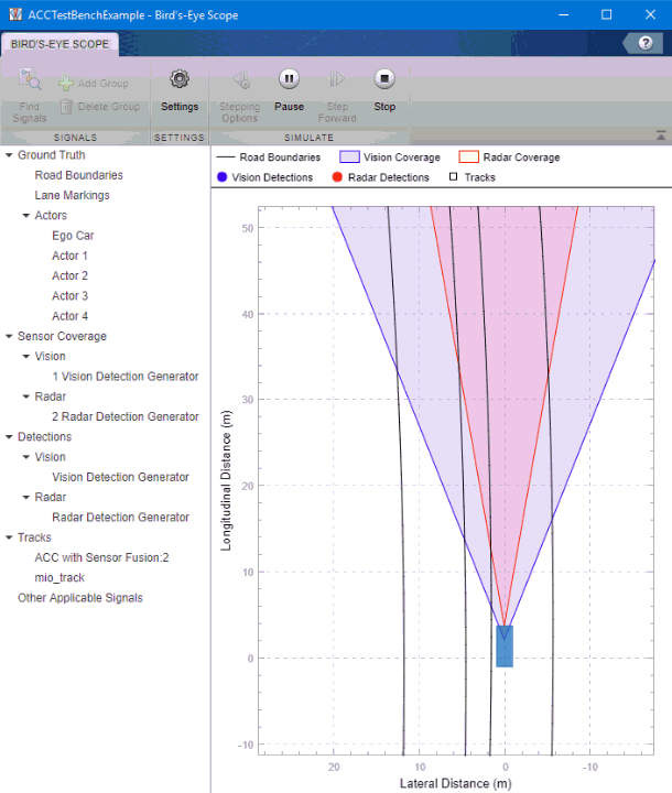 Figure 4 Birds-Eye Visualization of Adaptive Cruise Control Simulation in a Custom Driving Scenario