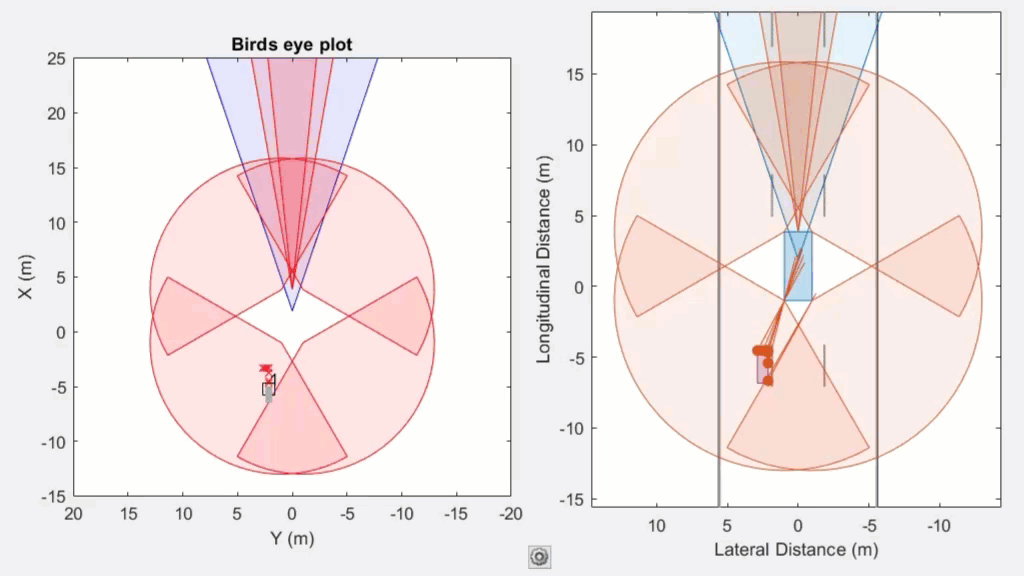 Using the Driving Scenario Designer, the UA team implemented algorithms using data from simulated scenarios. The GIF below shows a simple sensor fusion simulation which tracks a motorcycle through the side blind spot: