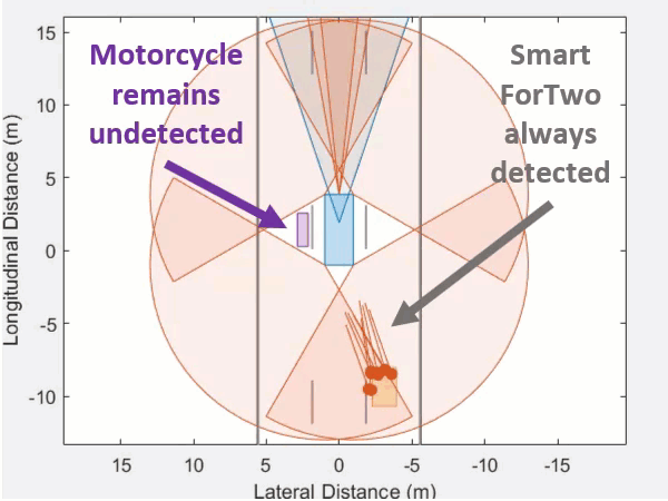 UA plans for the Blazer to change lanes at the demand of the driver, so the CAV system must confirm that there are no objects in the two side blind spots. UA investigated two edge cases, a motorcycle and the smallest current production vehicle, a Smart Fortwo. Shown in the GIF below, the Smart Fortwo (yellow) is always detectable, but the motorcycle (purple) could stay undetected: