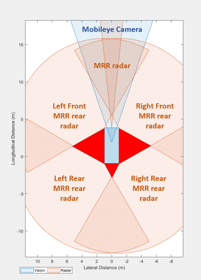 Using the Driving Scenario Designer, EcoCAR teams created sensors in a simulation environment based on component specification sheets, and teams visualized sensor coverage using Bird’s-Eye Plots (BEP). EcoCAR Mobility Challenge is sponsored by Intel, who provided a Mobileye 6 series system to each of the teams. The Mobileye uses an onboard processor to allow the vision system to identify pedestrians, bicyclists, vehicles, road signs, and lane markings. In the daytime, the system can detect target vehicles (vehicles of interest) within 150 m of the ego vehicle (the vehicle being controlled) with a 38° horizontal field of view (FOV). The full limits of the Mobileye are visualized below in the BEP: